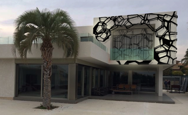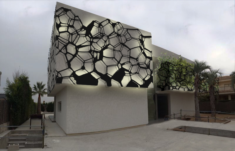 Para ejecutar el diseño de esta fachada se ha tomado como referencia el volumen de las burbujas que se rodean de una tela elástica que encuentra un punto de equilibrio formal entre la volumetría de las burbujas y la elasticidad del tejido. Un diseño pesado, generalmente de hormigón, que se resuelve con referencias ligeras, inspirado en un sofá tipo “chester” cómodo y consistente, es como un “hormigón blando” con las características de robustez del hormigón y la ligereza de las formas. El diseño se concreta a través del desarrollo de una serie de piezas que crecerán de manera parecida a como lo hace el mosaico de Penrose. Este mosaico se forma a partir de tres piezas hexagonales de hormigón, dos regulares y una irregular, un triángulo de metracrilato y un rombo de madera.