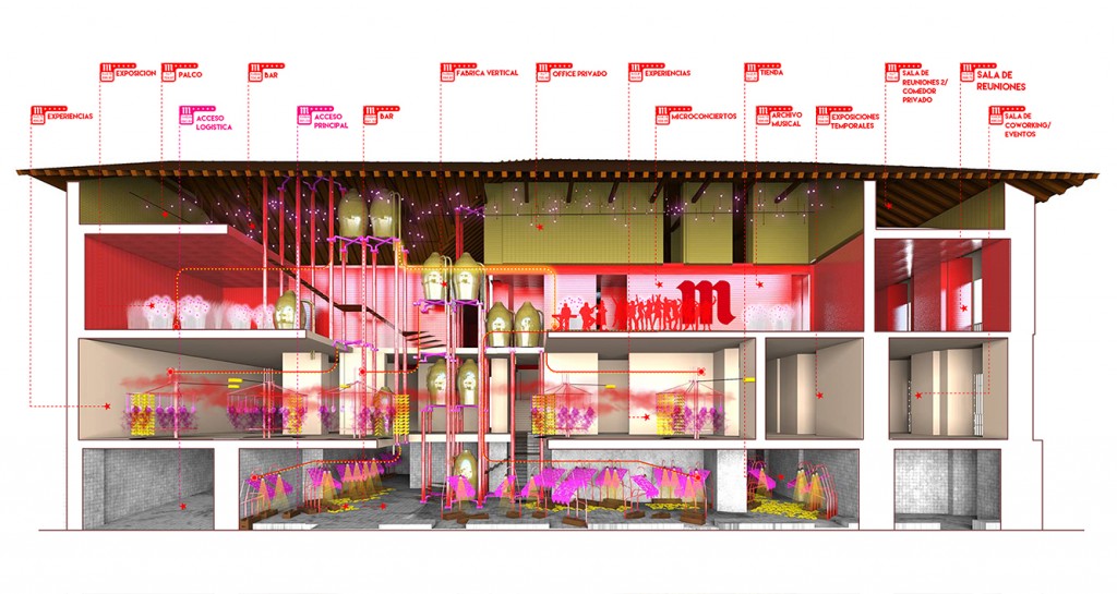 La propuesta pretende respetar el exterior del edificio y solo varía parcialmente su interior de tal modo que un espacio vertical continuo con brazos laterales por planta a modo de fluido, establece la parte principal de la propuesta. Este espacio, que incluye el patio, teje la parte principal del programa: fábrica de cerveza, cervecería, espacio expositivo y tienda.