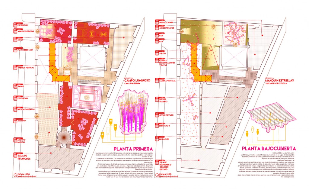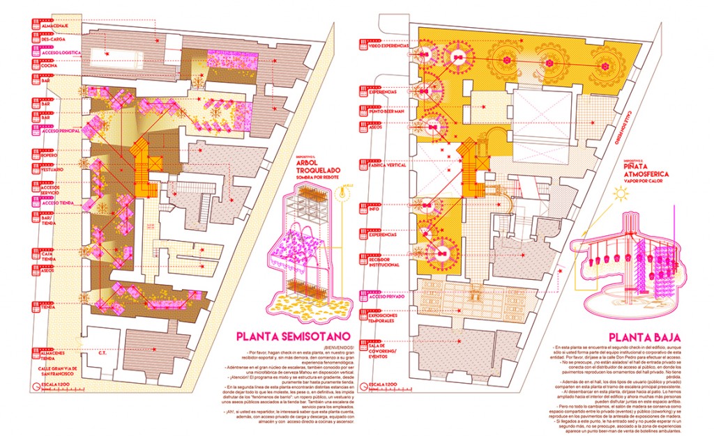 Cada planta se caracteriza por un objeto fenomenológico. La planta semisótano contiene el árbol troquelado, la planta baja queda marcada por la piñata atmosférica, la primera por el campo luminoso y la última por el campo de estrellas: Mahou n estrellas. Todas las plantas, y ocupando al mismo tiempo el espacio fluido, quedan recorridas por la fábrica de cerveza.